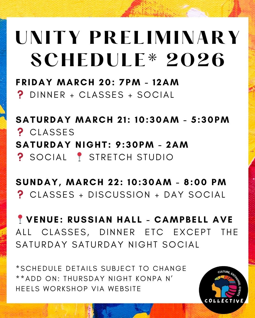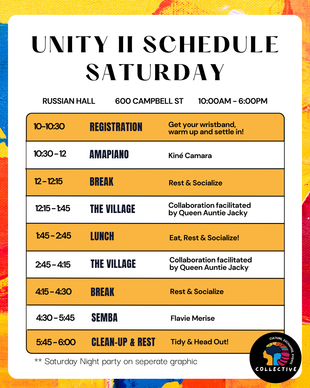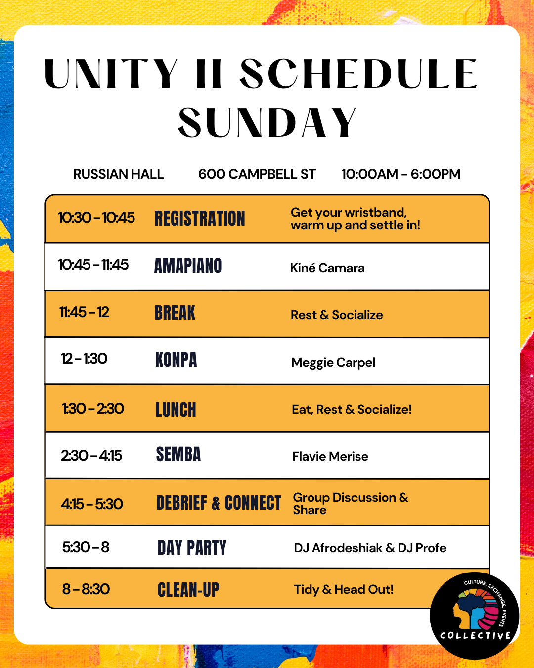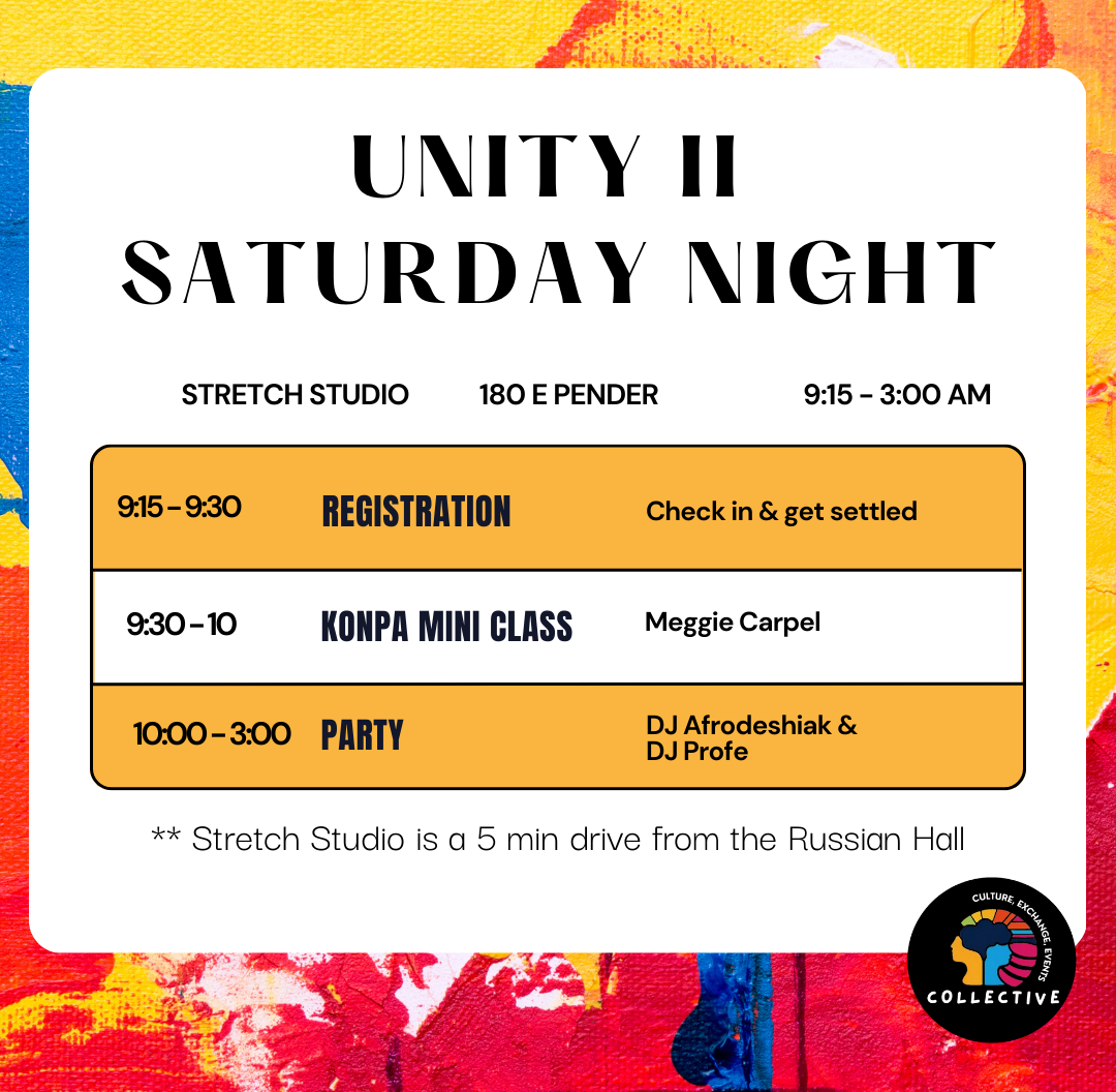 “Unity” is intended to create a space where we can connect across cultures, through food, music and dance. Bringing together styles hailing from different members of the African diaspora, bringing together people from all over, and learning, growing and vibing together.
